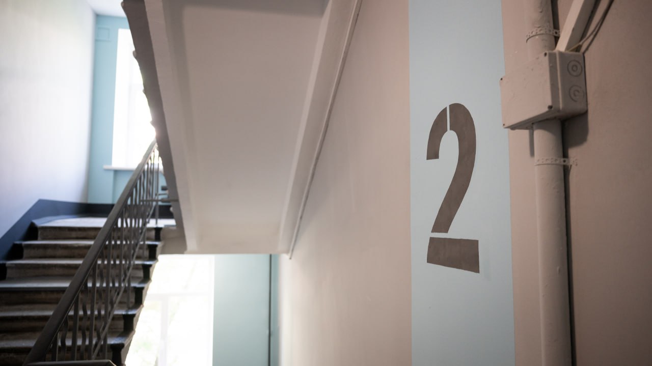 Специалисты выполняют покраску потолков и стен, обновляют входную группу, при необходимости меняют почтовые ящики и плиточное покрытие на 1-м этаже, убирают провода в короба.