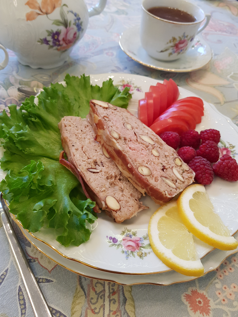 По завершении выпекания террин остудить в комнате, а затем поместить в холодильник на несколько часов. Это блюдо станет превосходной закуской для праздничного стола или быстрой, но изысканной идеей для ужина после трудового дня. Подается нарезанным на порции, в сопровождении свежих салатных листьев, помидоров и дольками лимона. Приятного аппетита!
