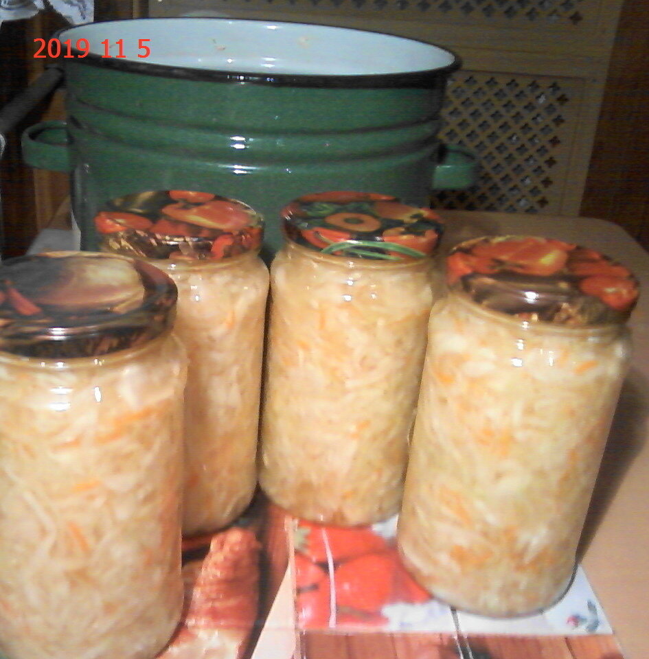 После остывания капусту расфасовывают по стерилизованным банкам, не отжимая сок. Этот прием обеспечивает сохранение хруста и лучшего вкуса на протяжении зимы. Обычно из одного ведра капусты получается около четырёх литровых банок, которые можно разместить в прохладном месте, таком как погреб или балкон с температурой от +5 до -5 °C.