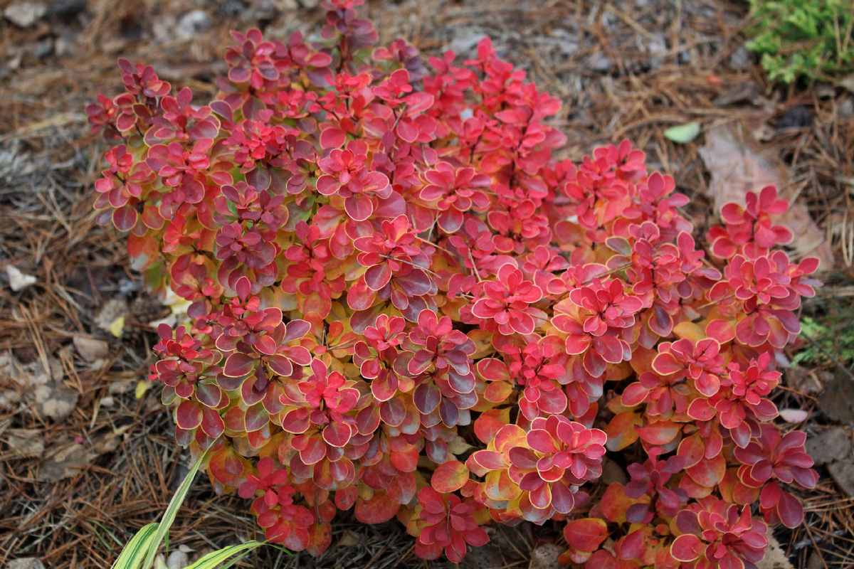 - Барбарис Тунберга Ruby Star: Его красные ягодки и ярко окрашенные листья становятся настоящим акцентом в пейзаже.