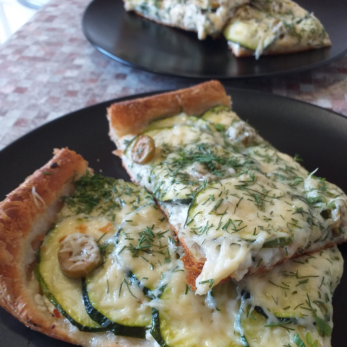 - Сверху разместите подготовленные кабачки, слегка перекрывая их, и при желании добавьте нарезанные оливки или маслины. Выпекайте пирог в разогретой духовке около 20-25 минут, пока он не станет золотистым.