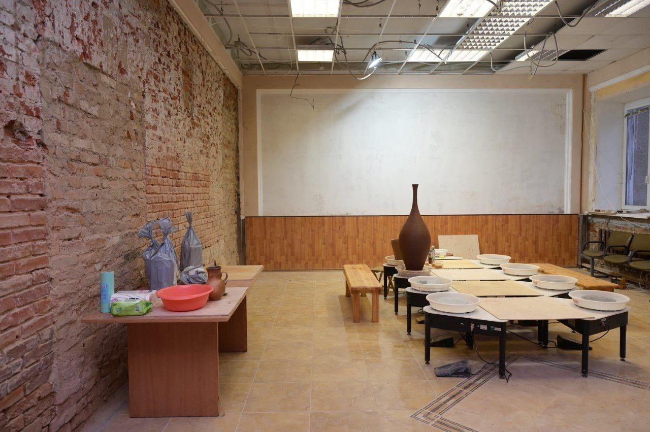 В главном здании, которому уже более 100 лет, идут ремонтные работы, а территорию вокруг здания уже полностью расчистили. В классе керамики установили гончарные круги, подготовили материал для проведения первых мастер-классов.