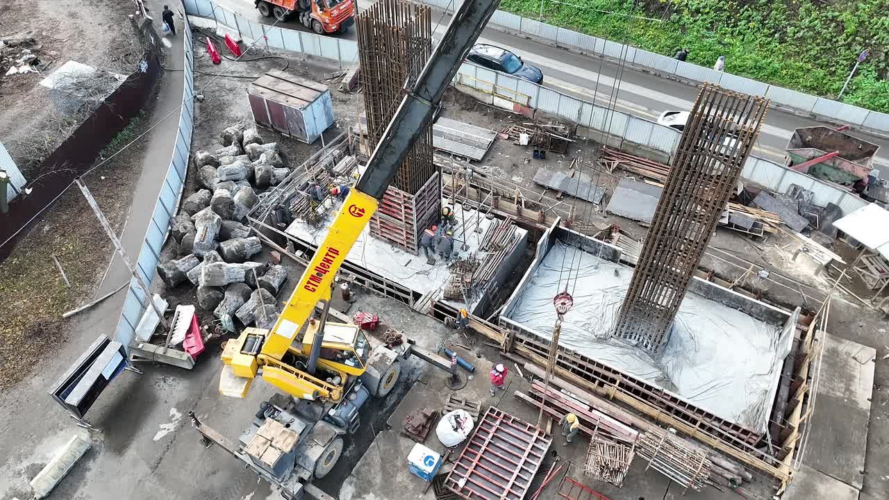 Также подрядчик продолжает вынос коммуникаций, бетонирование фундамента опор. Чтобы ускорить темпы строительства, работы на объекте ведутся в две смены — днем и ночью.