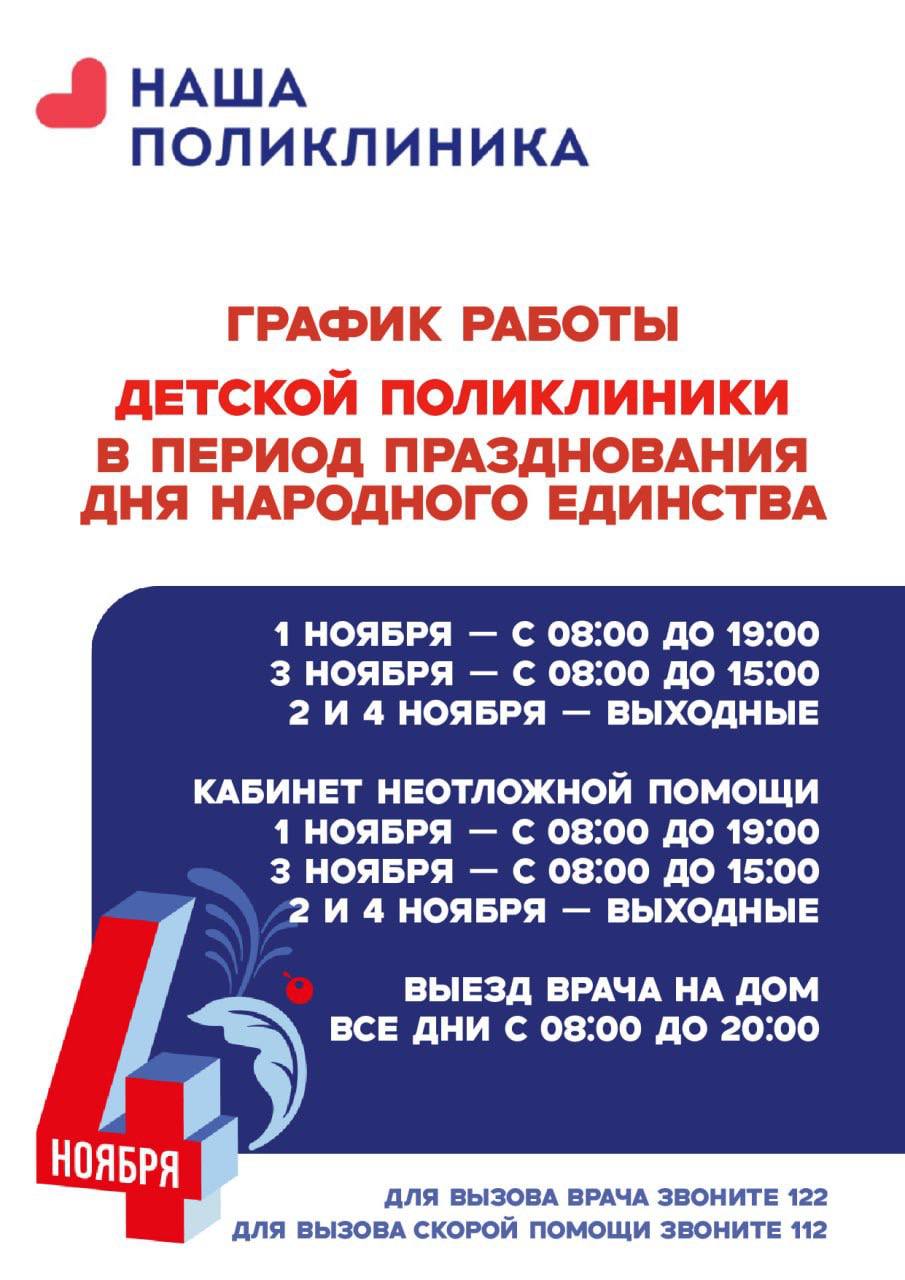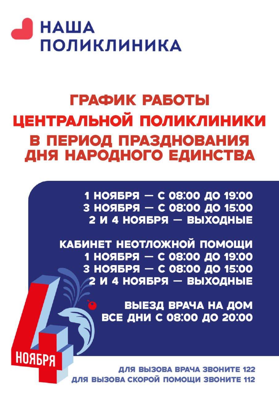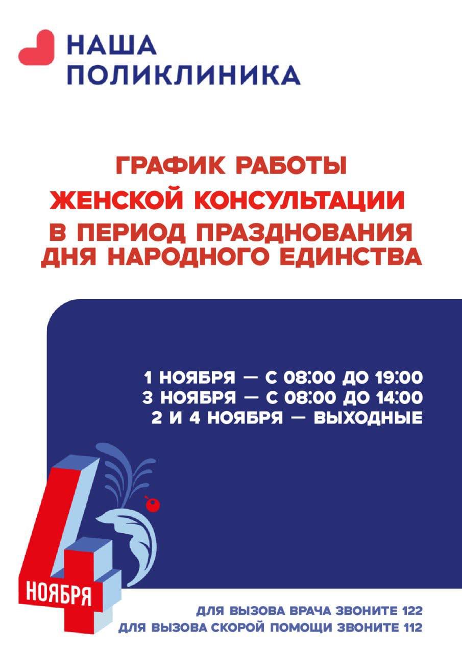 - 3 ноября: поликлиники - 8:00 -15:00; женская консультация - 8:00 - 14:00.