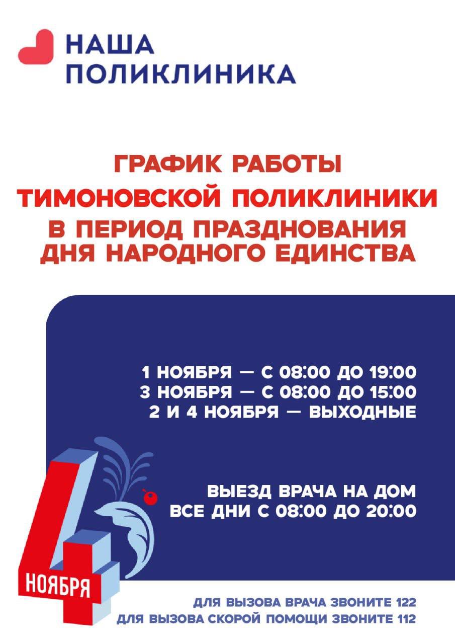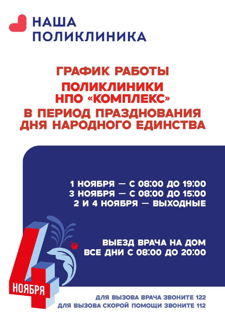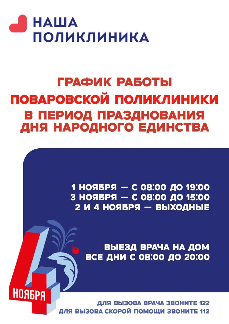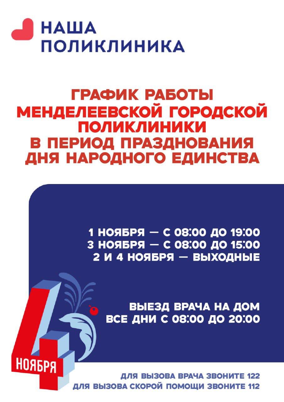 - 3 ноября: поликлиники - 8:00 -15:00; женская консультация - 8:00 - 14:00.