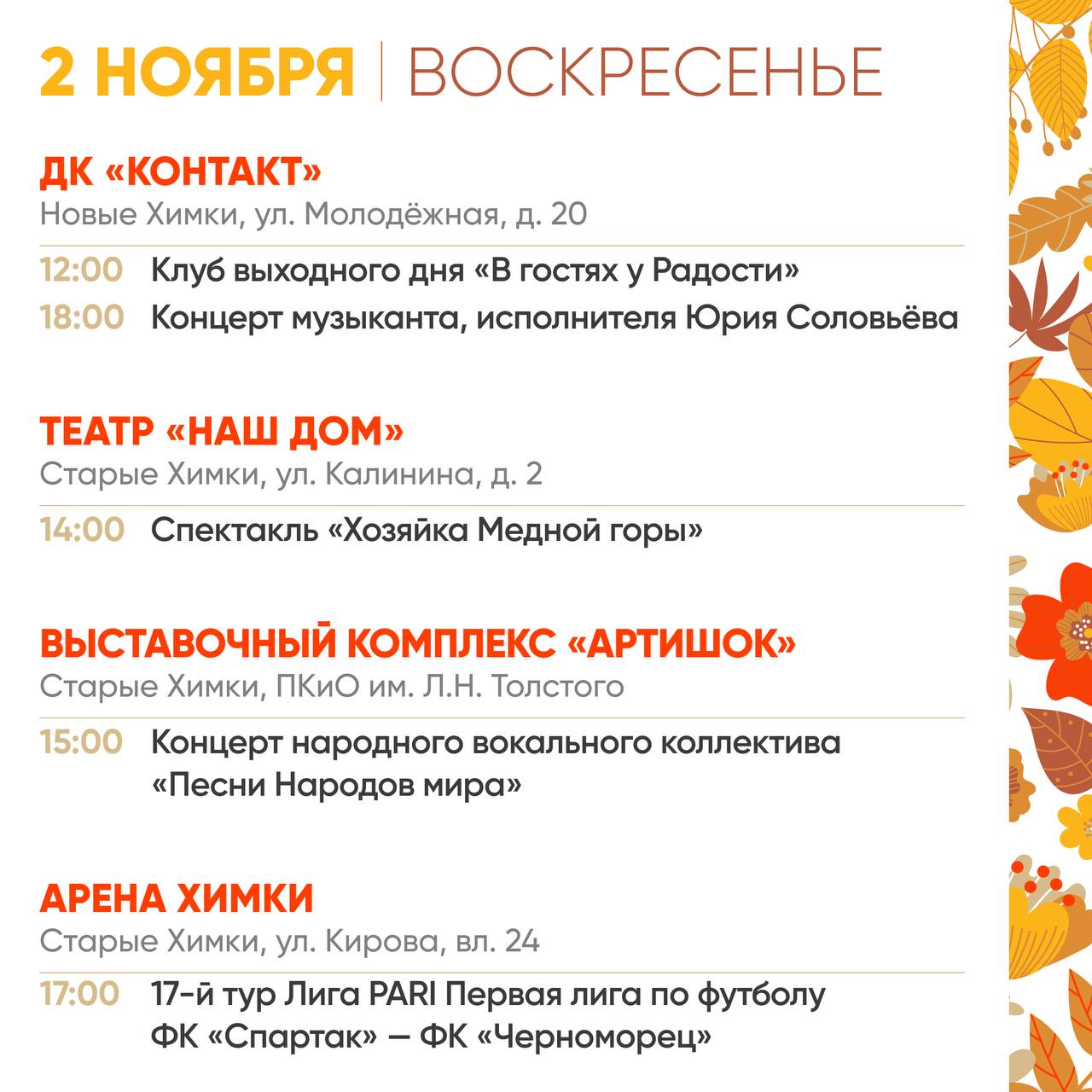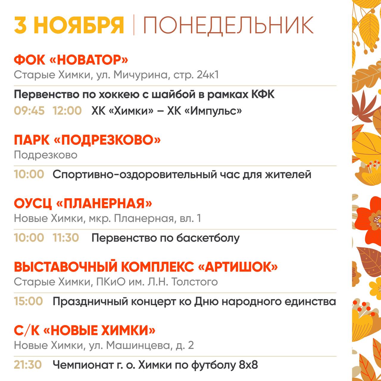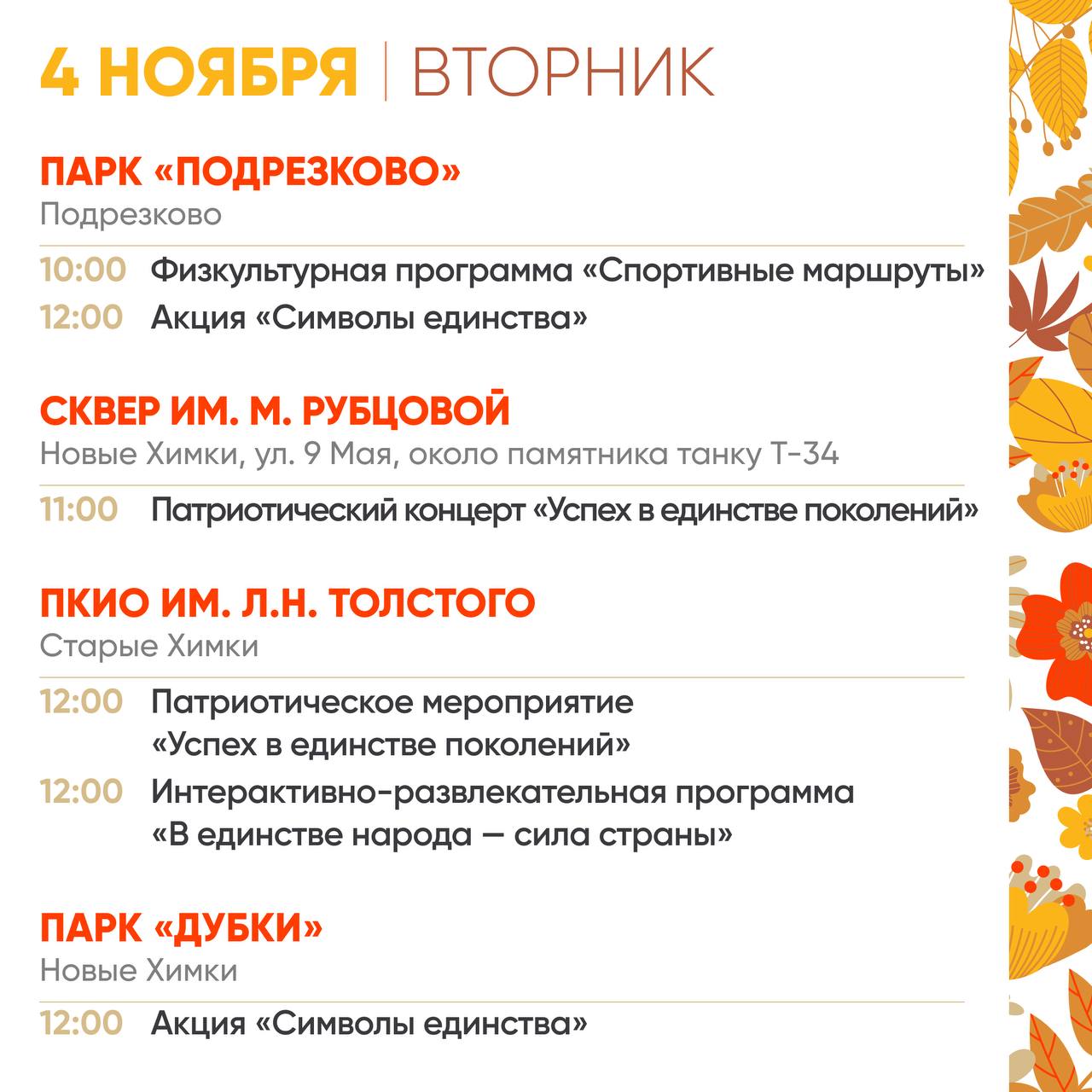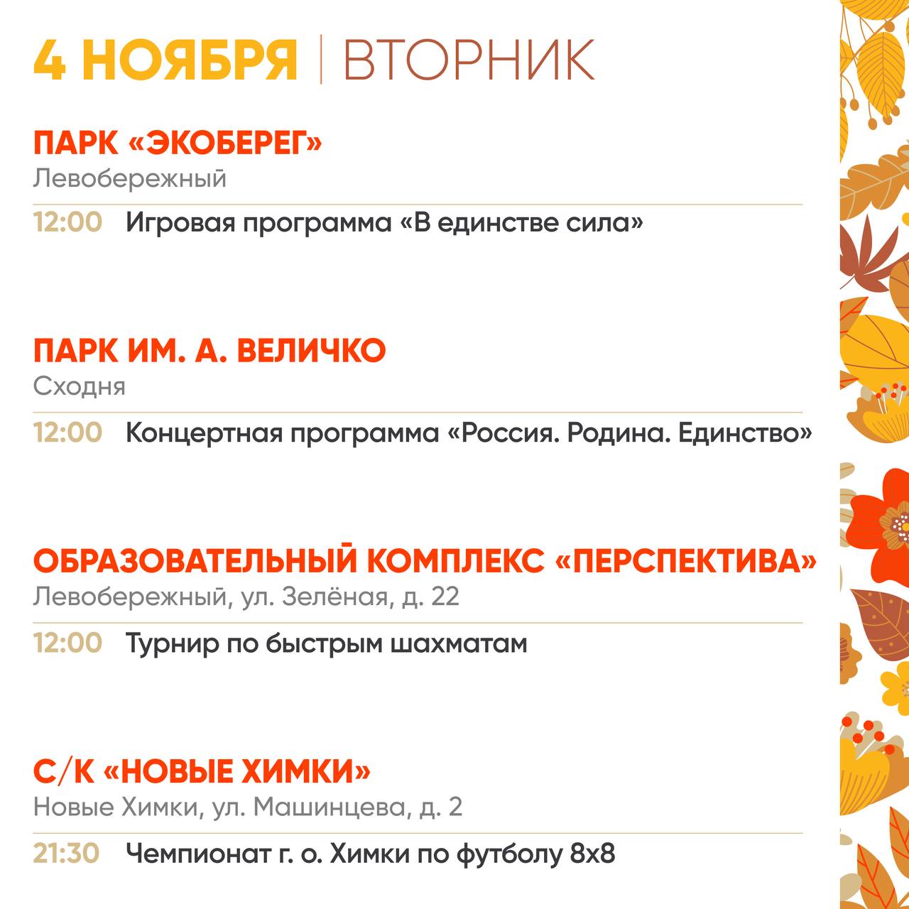 Ко Дню народного единства в Химках проведут концерты, развлекательные программы, познавательные викторины и другие праздничные мероприятия. Также в городе пройдут традиционные культурные и спортивные активности.