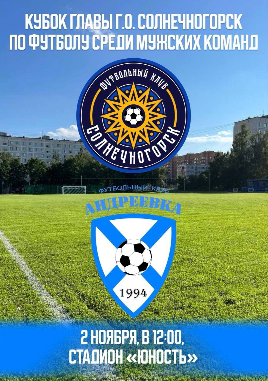 На стадионе «Юность» в Андреевке состоится первый матч на Кубок Главы городского округа Солнечногорск по футболу среди мужских команд, сообщает информационный центр «Сенеж».