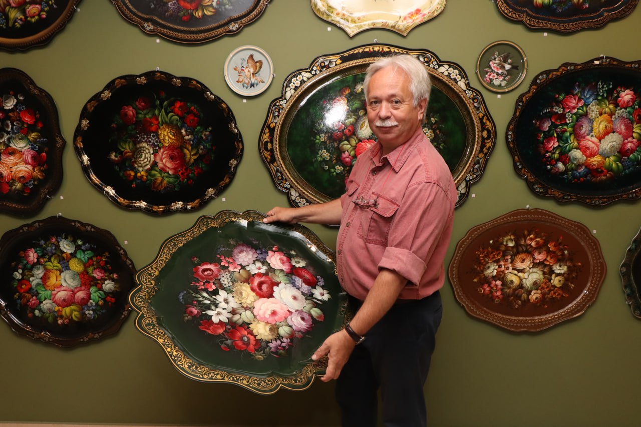 Михаил Викторович занимается жостовской росписью больше 40 лет. За эти годы ни один его узор на жостовском подносе не повторился.
