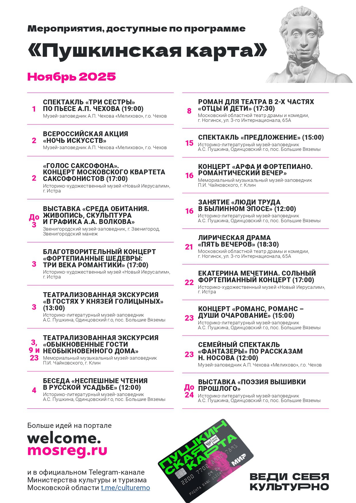 Мероприятия доступные по ПУШКИНСКОЙ КАРТЕ в ноябре 2025 года в Московской области
