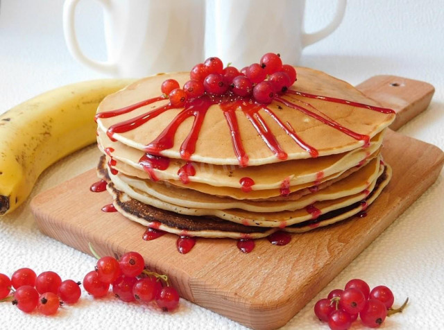 Готовые панкейки аккуратно складывайте на тарелку. Их можно украсить по вашему желанию: сиропом, ягодами или взбитыми сливками. Подавайте горячими — они прекрасно сочетаются с медом, джемом или сгущенным молоком. Эти банановые панкейки обязательно станут любимым завтраком!