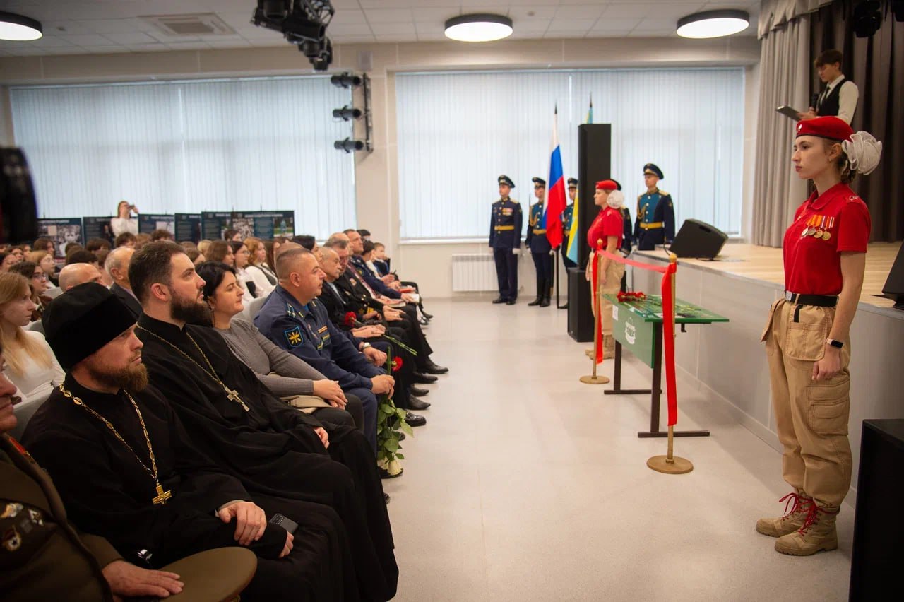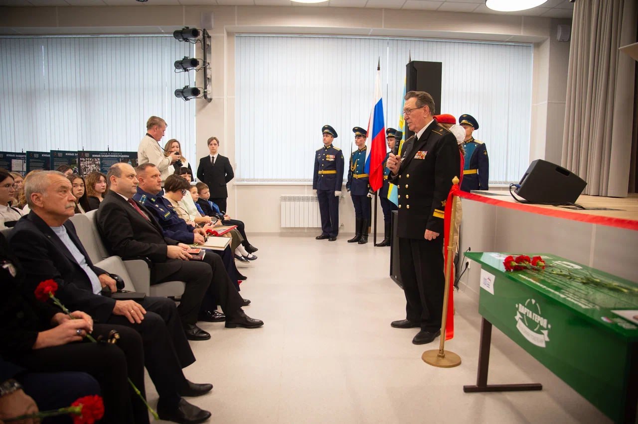 В торжественной церемонии открытия «Парты Героя» присутствовали родные бойца, летчик-космонавт Михаил Тюрин, контр-адмирал Вячеслав Юрченко, представители воинской части, руководство учебного заведения и школьники.