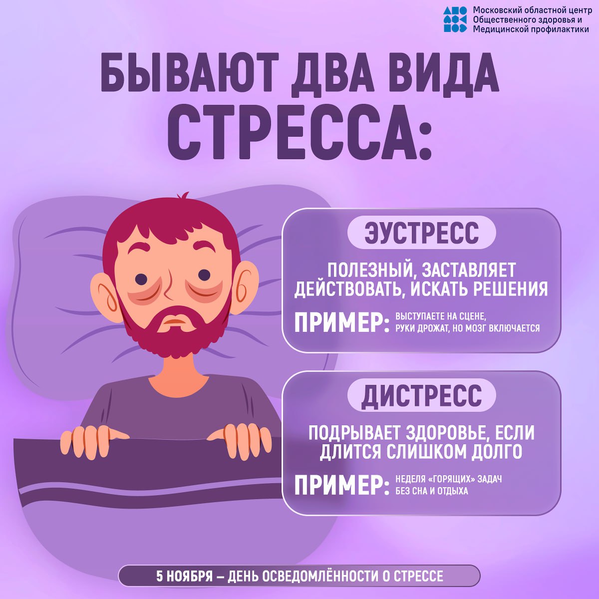 Выделяют 2 вида стресса: положительный или эустресс, и отрицательный или дистресс. Положительный стресс помогает организму мобилизоваться, а отрицательный, наоборот, подрывает здоровье человека.