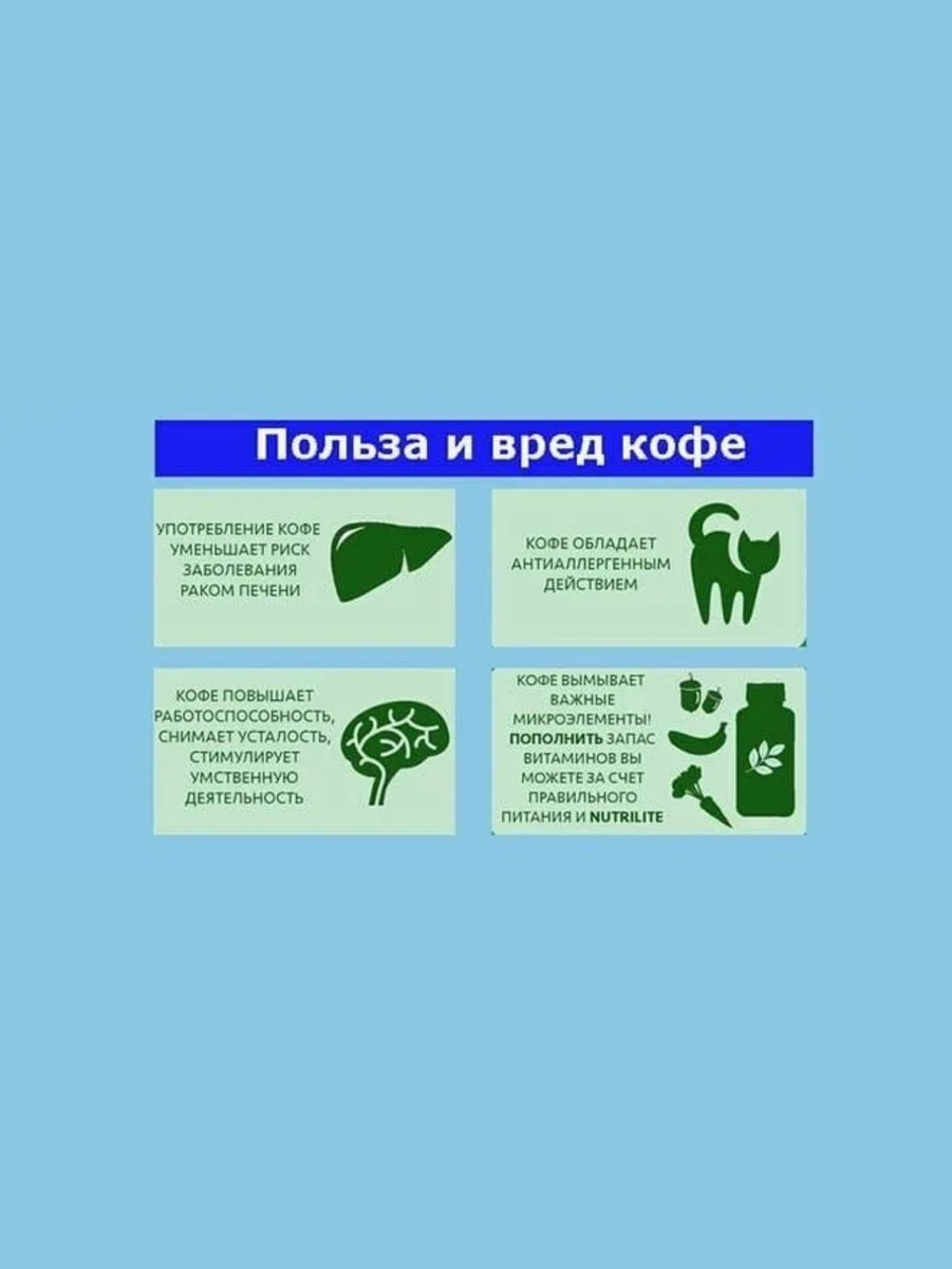 Энергия и бодрость: Кофеин, содержащийся в кофе, мягко стимулирует нервную систему, что способствует повышению уровня энергии и улучшению настроения.Улучшение памяти и концентрации: Исследования показывают, что кофе может повысить продуктивность, улучшая внимание и память.Антиоксиданты: Кофе богат антиоксидантами, которые помогают защищать клетки от повреждений, замедляя процессы старения и снижая риск хронических заболеваний.Снижение рисков заболеваний: Регулярное потребление кофе связано с меньшей вероятностью развития диабета 2 типа, болезни Паркинсона и даже некоторых видов рака.Возможный вред кофе