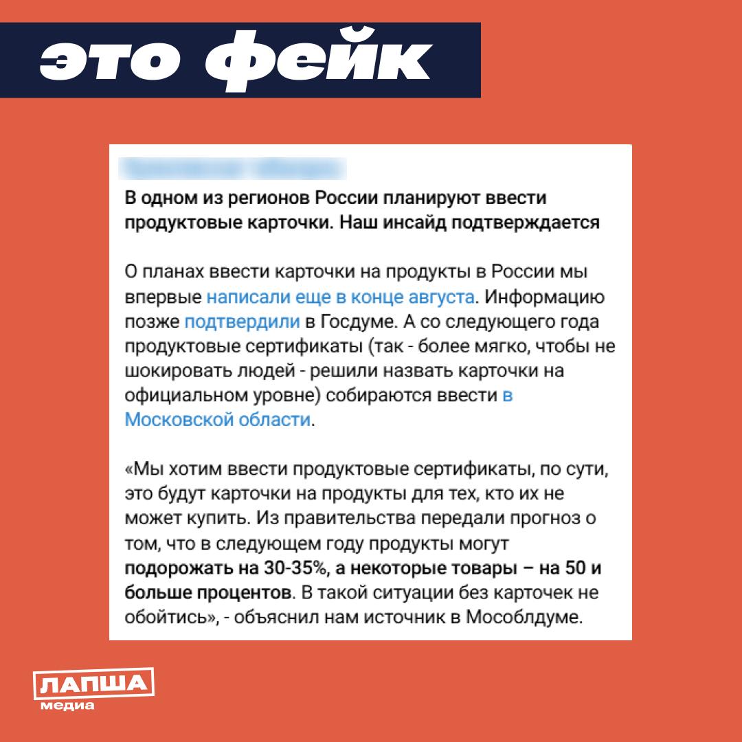 Это фейк, причем не новый. Тг-канал, распространивший это сообщение, регулярно заявляет о продуктовых сертификатах по всей России. Продовольственного кризиса в стране нет, дефицит продуктов не предвидится. Это может проверить любой человек, зайдя в магазин.