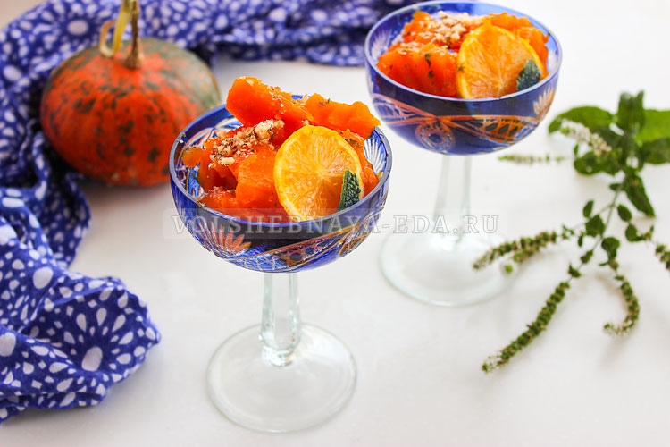 Как только сироп станет более густым, снимите сковороду с плиты и дайте тыкве отдыхать 1 час. За это время она полностью впитает смеси ароматы и остынет. Подавайте этот чудесный десерт охладив, посыпав грецкими орехами. Кусочки тыквы, как настоящие сладкие конфетки, будут источать ноты мяты и цитрусов, создавая незабываемую атмосферу для чаепития.