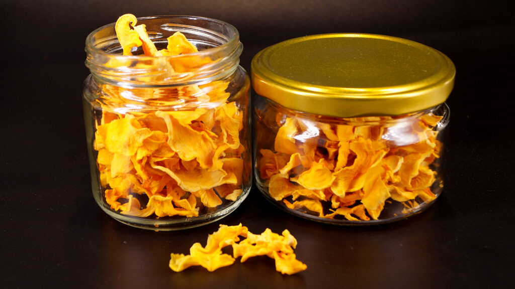 Для сушилки тыкву нарезают на тонкие пластины, что ускоряет процесс. Проходя через сушки при температуре около 70 °C, изделия требуют примерно 7 часов на полное высушивание. Окончательная текстура должна быть гибкой, не ломкой. После завершения сушки остатки хранят в герметичных контейнерах в сухом и темном месте — так они сохранят свои качества на долгий срок.