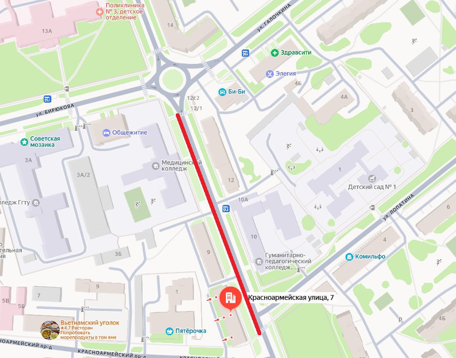 в период с 8.00 11 ноября 2025 г. до 8.00 18 января 2026 г. будет ограничено движение транспорта от д. 7 на ул. Красноармейской до кругового движения на пересечении ул. Бирюкова и Галочкина.