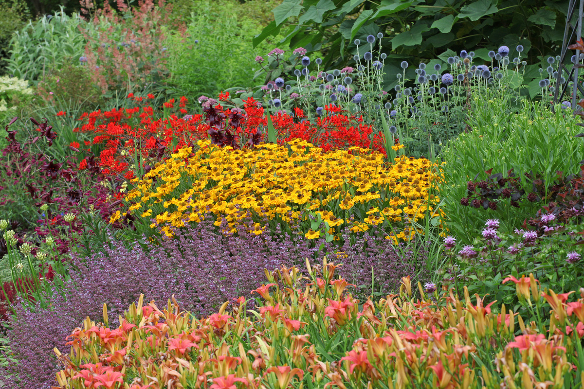При создании цветника важно учитывать структуру и дизайн. Выделите три уровня: передний, средний и задний—композиция будет выглядеть намного интереснее, если соблюсти ярусность. За основу можно взять засухоустойчивые многолетники, которые красиво цветут в жаркую погоду.