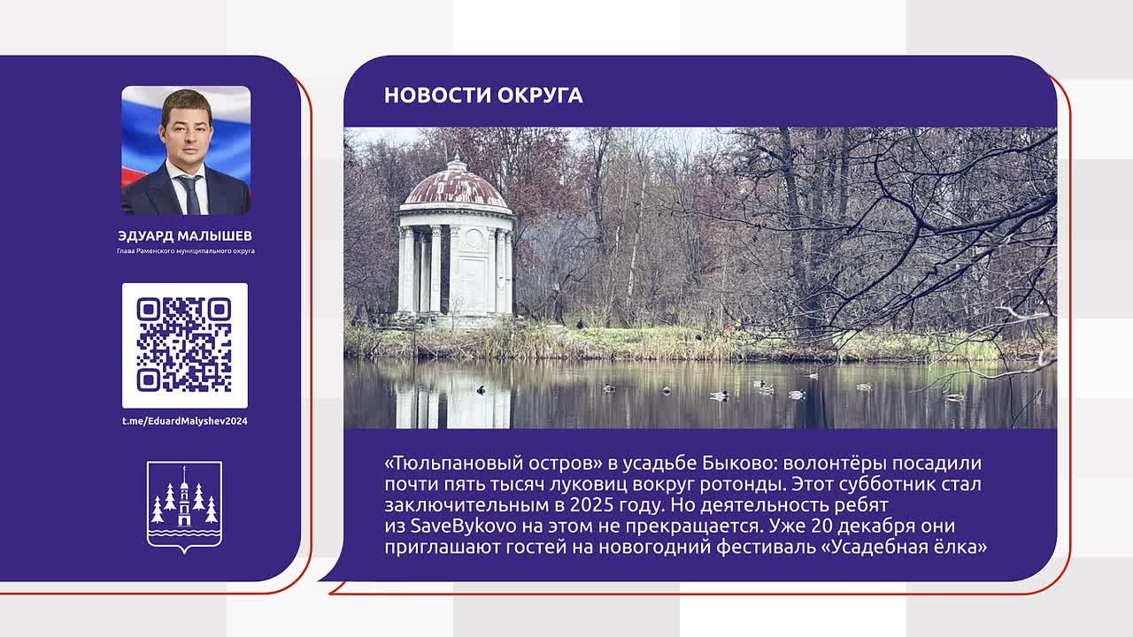 «Тюльпановый остров» в усадьбе Быково: волонтёры посадили почти пять тысяч луковиц вокруг ротонды. Этот субботник стал заключительным в 2025 году. Но деятельность ребят из SaveBykovo на этом не прекращается. Уже 20 декабря они приглашают гостей на новогодний фестиваль «Усадебная ёлка»
