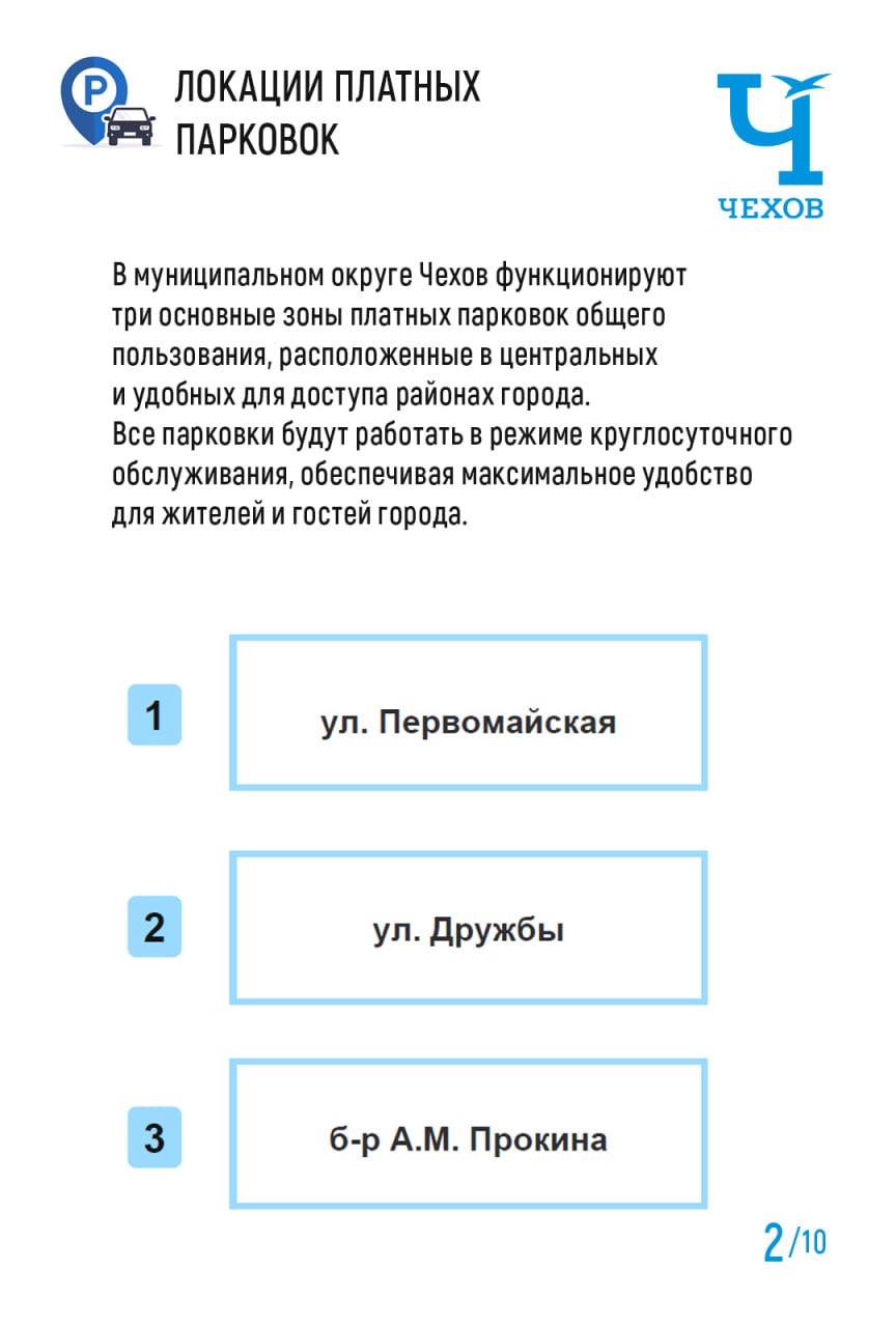 Для организации парковок были выбраны три зоны, расположенные в центре города на улицах Первомайская (правая сторона), Дружбы и на бульваре А.М. Прокина. В общей сложности будет обустроено 83 машиноместа в том числе 9 мест для инвалидов.
