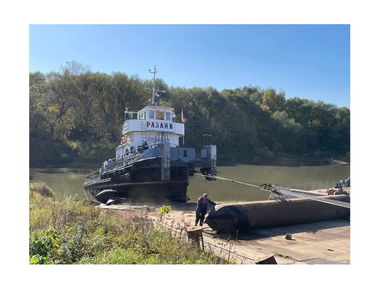 На берег выкатан теплоход «Разлив» для планового ремонта и подготовки к очередному освидетельствованию.