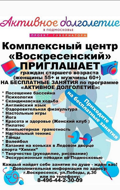 Комплексный центр социального обслуживания и реабилитации "Воскресенский" приглашает жителей старшего возраста (женщин 55+ и мужчин 60+) присоединиться к программе Губернатора Московской области "Активное долголетие". Для участия обязательно наличие социальной карты жителя Подмосковья.