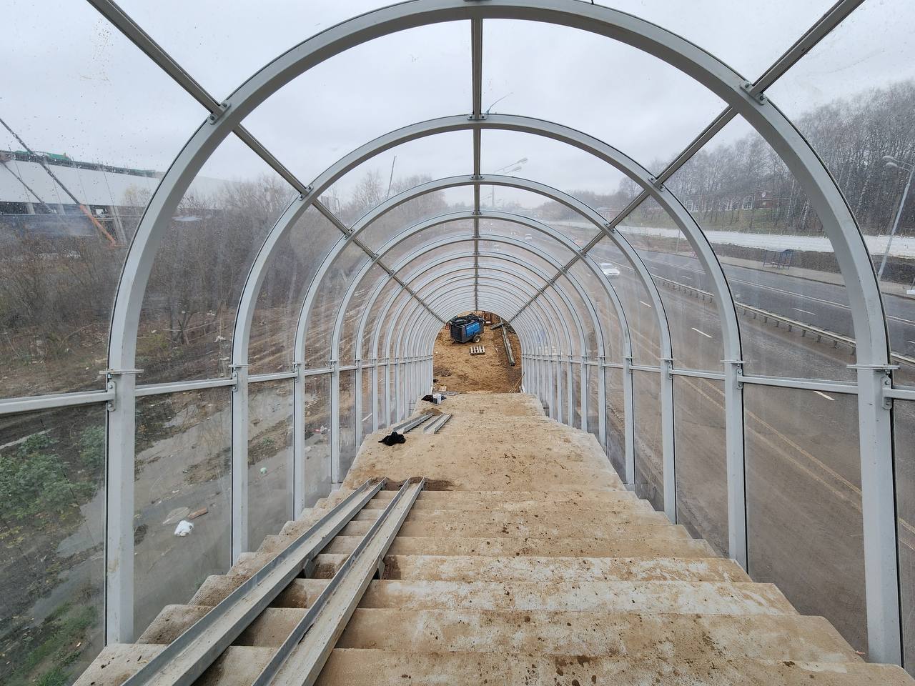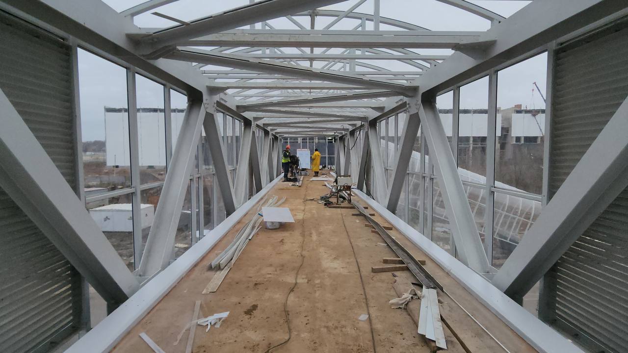 Первый переход готов на 95%. Завершены работы по остеклению пролёта и башен, рабочие приступают к монтажу внутреннего освещения.