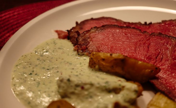 Слегка остудить нежный чесночно-сметанный соус, перелить его в соусник и подавать с мясным блюдом.