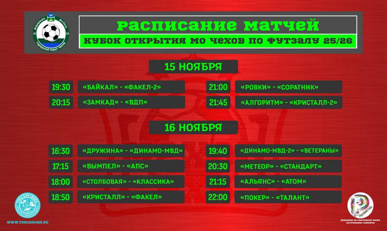 Расписание матчей Чемпионата муниципального округа Чехов по футзалу сезона 2025/2026, которые пройдут в субботу и воскресенье