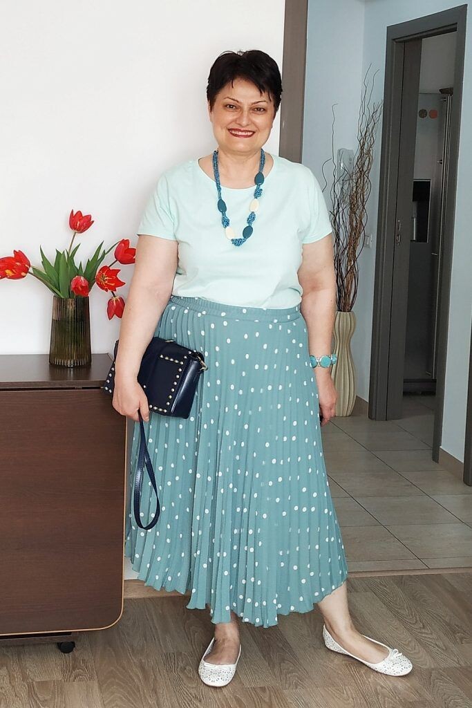 1. Легкость и уют: серо-голубая юбка-плиссе длиной до щиколотки с белым горошком идеально смотрится в сочетании с белой базовой футболкой. Завершите образ практичными белыми балетками и крупными украшениями в тоне юбки.