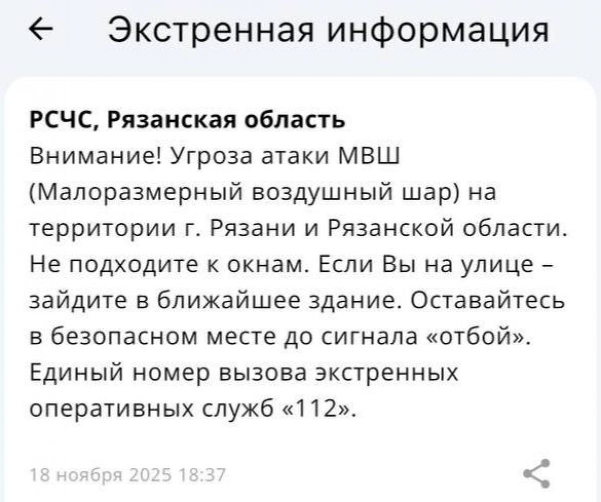 В воздушном пространстве России над Рязанью впервые объявили угрозу атаки малоразмерного воздушного шара.