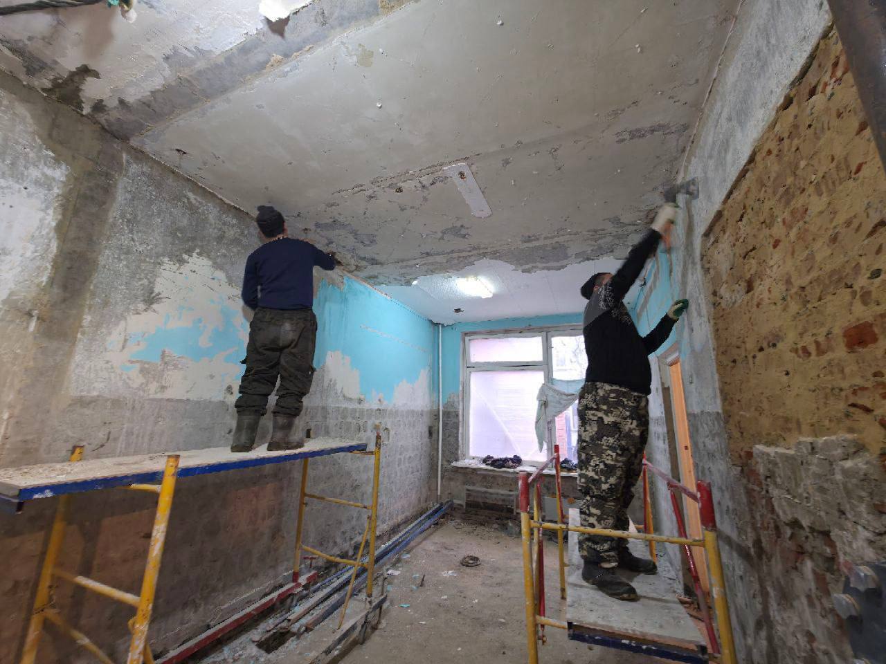 Параллельно выполняется оштукатуривание стен и очистка потолков. Скоро строители приступят к стяжке пола.