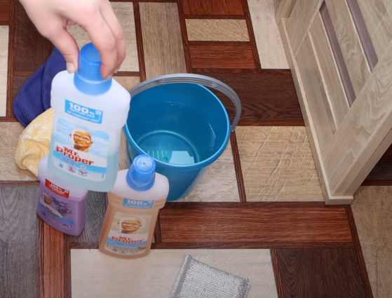 - Полы: Для обработки всего помещения разбавьте два колпачка средства в ведре с водой. Для сложных загрязнений используйте концентрат: капните на губку и просто протрите нужное место.
