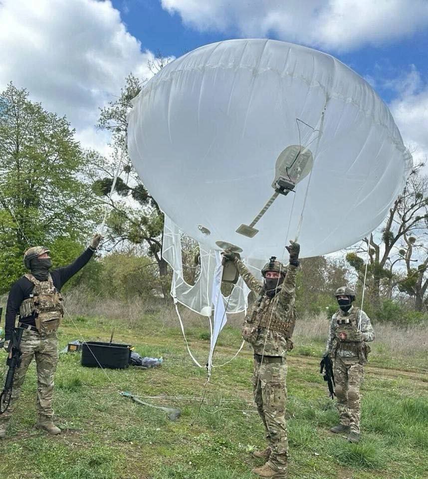 Эти шары представляют большую опасность, чем беспилотники, из-за их высокой грузоподъемности. Метеозондные воздушные шары (МВШ) способны нести сразу несколько крупных мин. На фотографии представлен как раз один из таких шаров.