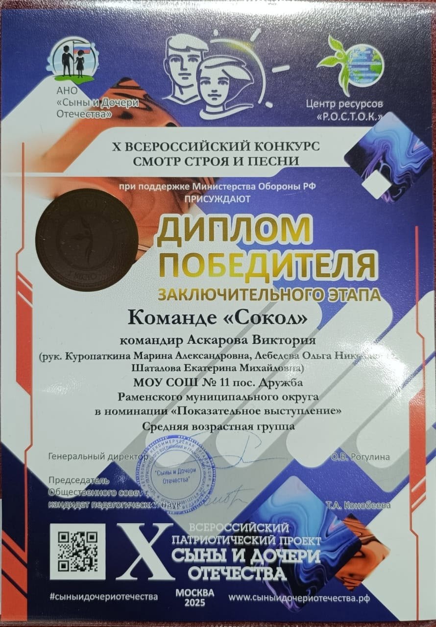 Поздравляем с заслуженными победами во Всероссийском патриотическом проекте «Сыны и Дочери Отечества»! Ученики кадетских классов школы №11 посёлка Дружба приняли участие в заключительном этапе проекта – «Марш Победителей», который проходил в Зале Полководцев и Зале Славы Музея Победы. В этом году в состязаниях участвовали 48 лучших команд со всей России.