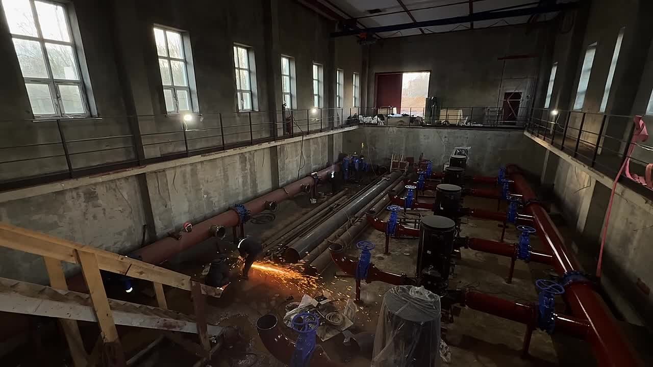 Сейчас рабочие продолжают монтировать внутренние стальные трубопроводы. Диаметр труб — от 300 до 500 мм, и каждая оснащена запорной арматурой для точного контроля потоков.