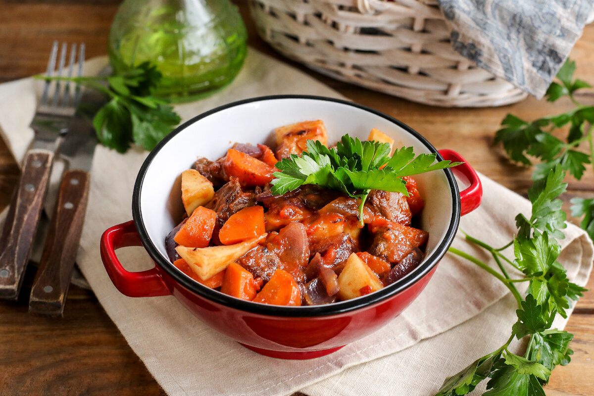 На той же сковороде обжариваются нарезанные лук, морковь и пастернак около 3-4 минут. Когда овощи станут мягкими, их приправляют солью и перцем по вкусу, после чего с овощами смешивается обжаренная говядина. В это время добавляется томатная паста, чесночный порошок и лавровый лист. Важный момент: вливается говяжий бульон, который придаст блюду насыщенности. Все ингредиенты тушатся на среднем огне в течение 10-12 минут. Это время позволяет овощам стать мягкими и пропитаться вкусами.