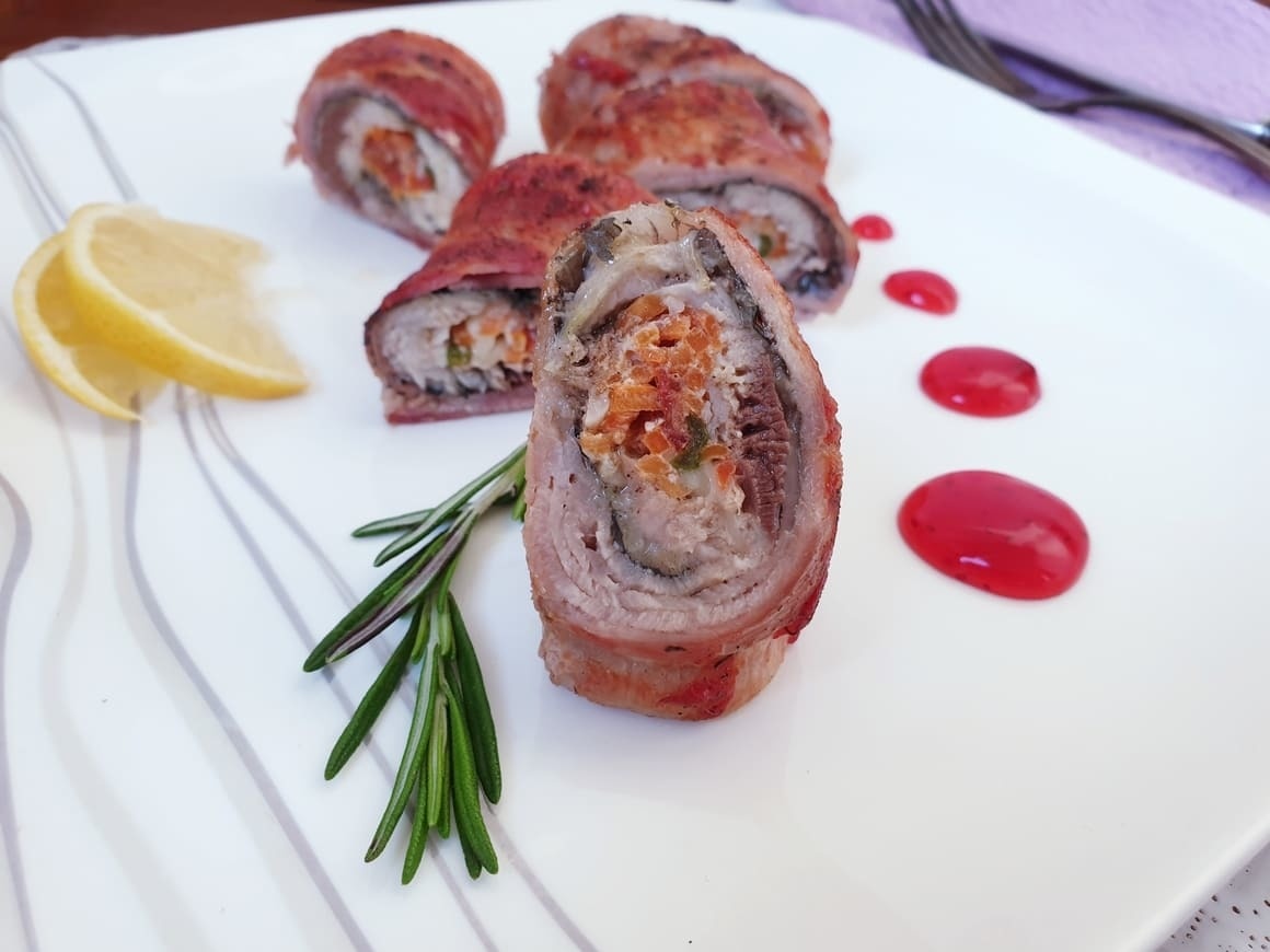 Первым делом подготовьте сардины, выложив их на противень. Затем придайте вкус, добавив соль, перец и сок лимона. Следующим шагом станет укладка овощей и сыра на рыбу. После этого сверните рулетиком и оберните его полоской бекона.