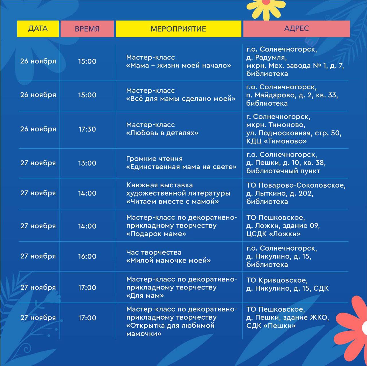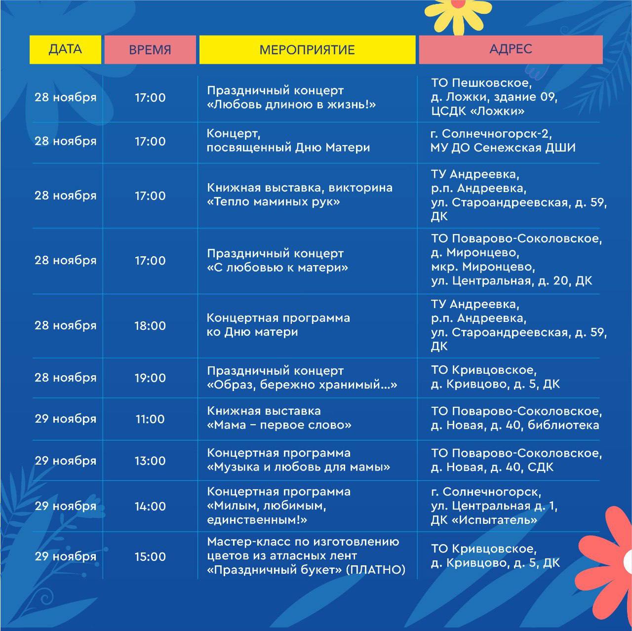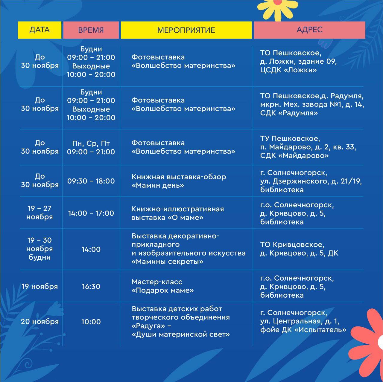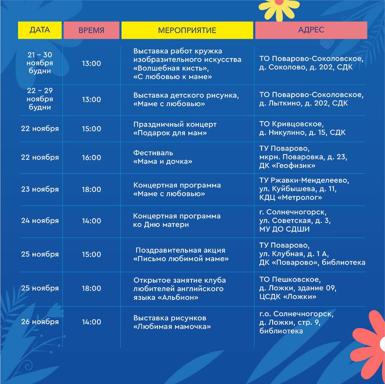 Мы запускаем марафон праздничных событий по всему округу! Приглашайте своих мам и приходите всей семьёй.
