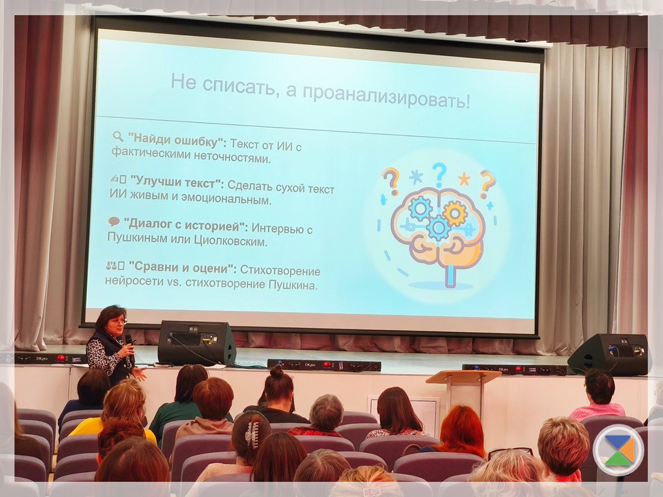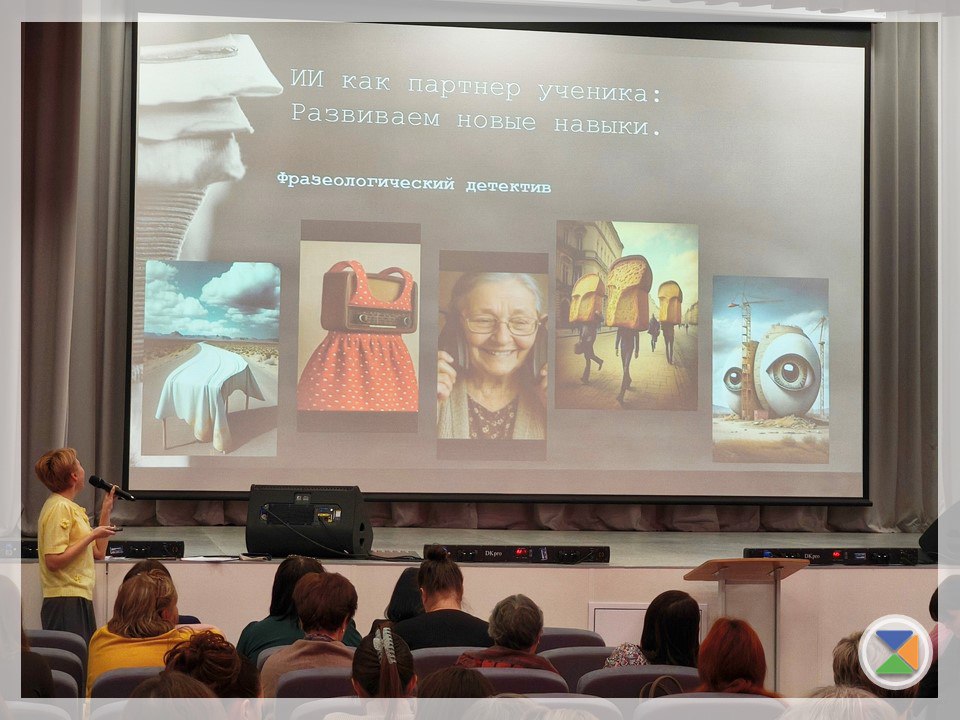 В ходе панельной дискуссии заместитель директора по методической работе Рыбина Анна Анатольевна актуализировала вызовы и угрозы, которые несет в себе искусственный интеллект и раскрыла весь спектр возможностей, которые искусственный интеллект открывает для педагогов: