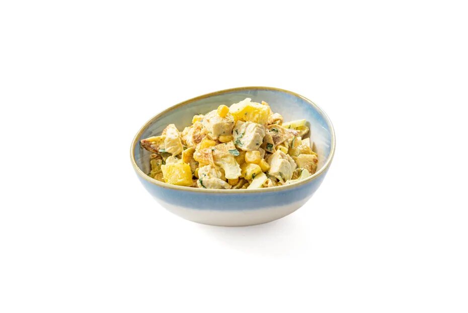 Пока индейка готовится, можно заняться остальными ингредиентами. Ананас нарезают крупными кубиками, а стебель сельдерея — тонкими ломтиками. Специи в виде измельченной петрушки смешивают с майонезом и добавляют карри для необычного вкусового акцента. Блины нарезают ромбиками, что придаст закуске стильный вид.