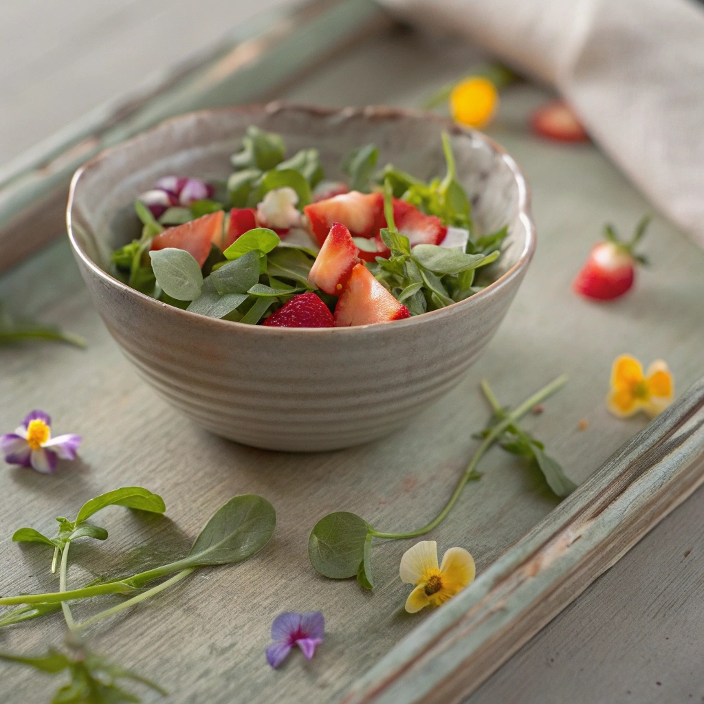 Приготовление: Промойте рукколу и шпинат, обсушите их и порвите на крупные кусочки. Клубнику нарежьте ломтиками, а мяту мелко нарежьте. В миске смешайте оливковое масло, бальзамический крем, соль и перец. Затем добавьте все ингредиенты и аккуратно перемешайте. Подавайте немедленно, чтобы сохранить хруст свежей зелени и аромат клубники.