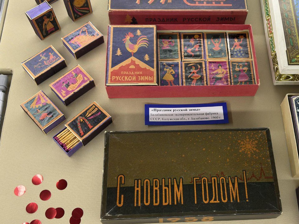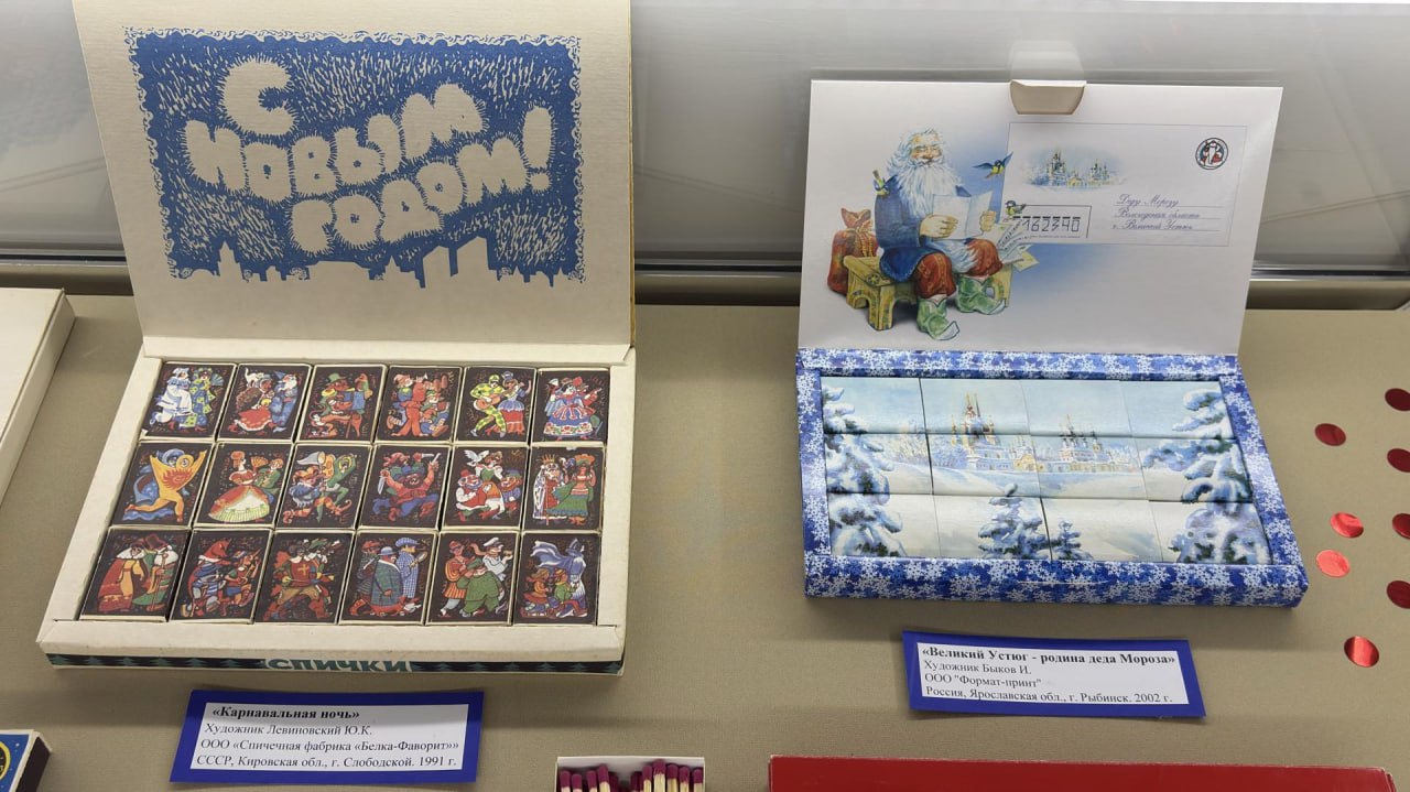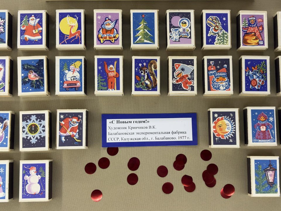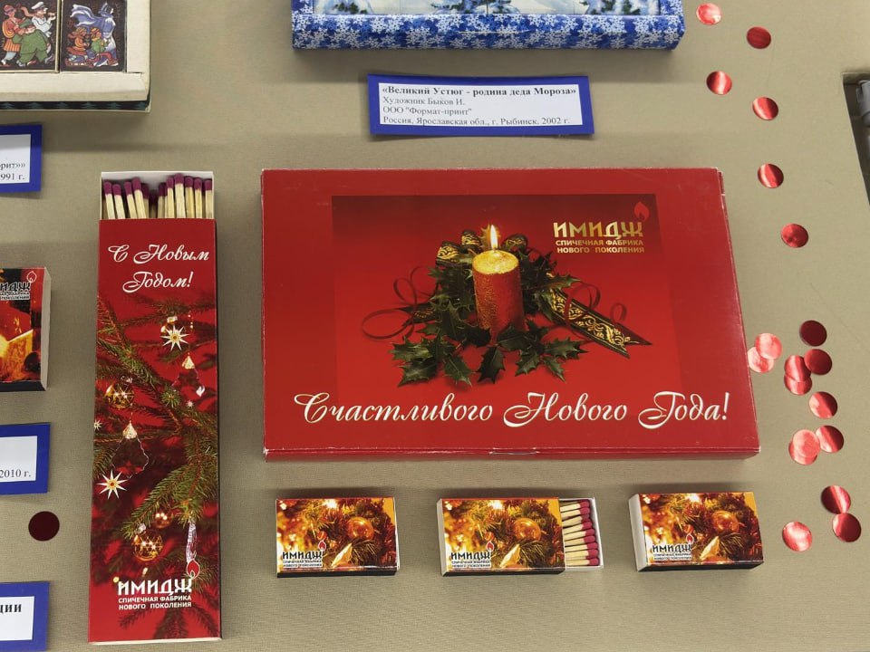 Экспозиция под названием «Новый год в коробке спичек» представляет вниманию зрителей коллекцию из более ста редких экземпляров спичечных коробков и праздничных этикеток, собранных Музеем спички и клубом любителей филумении «Сувенир». Каждая картинка — маленький плакат, наполненный смыслом.