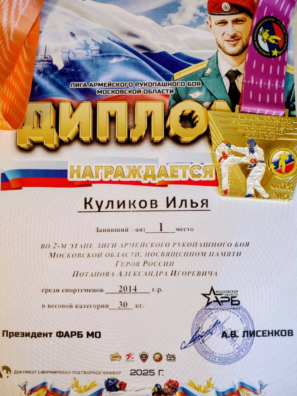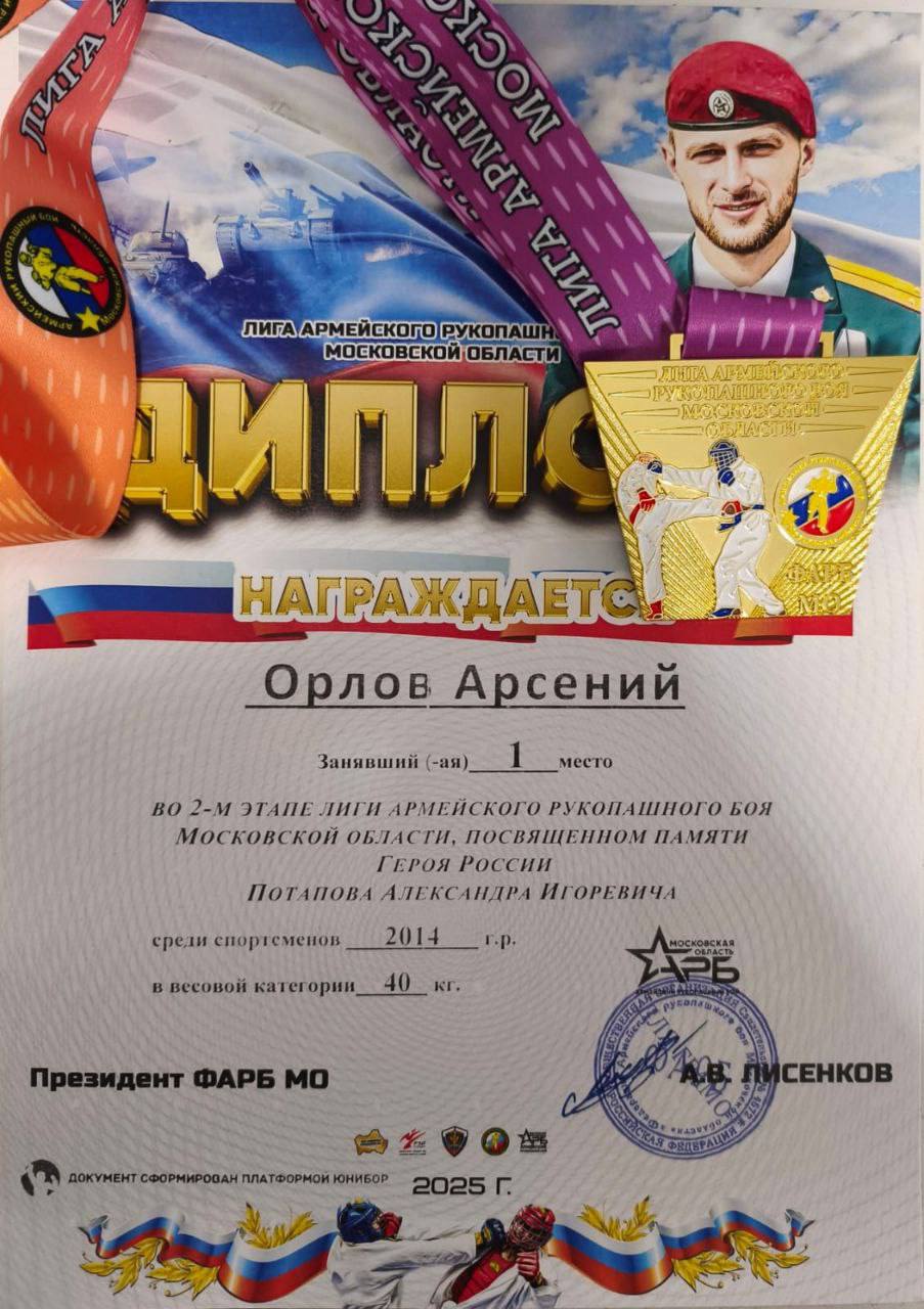 В г. Щёлково Московской области прошёл второй этап Лиги армейского рукопашного боя, посвящённый памяти Героя России Потапова Александра. В этом памятном турнире приняли участие талантливые ученики 5 «Б» класса — Куликов Илья и Орлов Арсений.