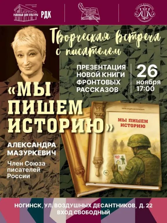 Центр культуры имени Г.В.Калиниченко 26 ноября в 17:00 часов приглашает на презентацию новой книги фронтовых рассказов члена Союза писателей России - Александры Мазуркевич «Мы пишем историю».