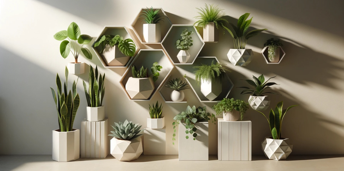 - Кашпо: Это декоративный элемент, который не имеет отверстий и служит для сбора избыточной воды, защищая поверхность мебели.