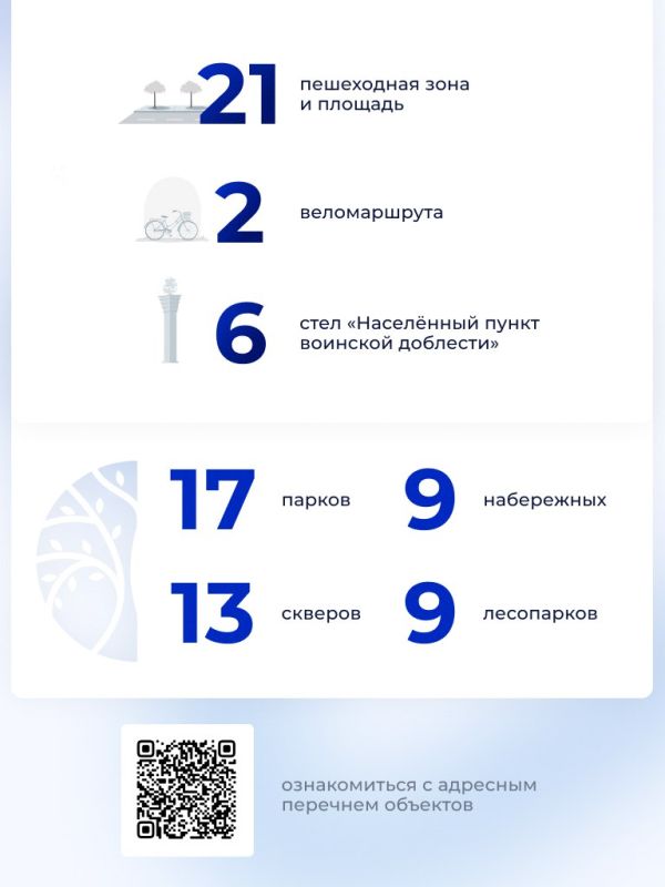 Кроме того, работы затронут девять набережных, шесть стел «Населённый пункт воинской доблести» и два веломаршрута.