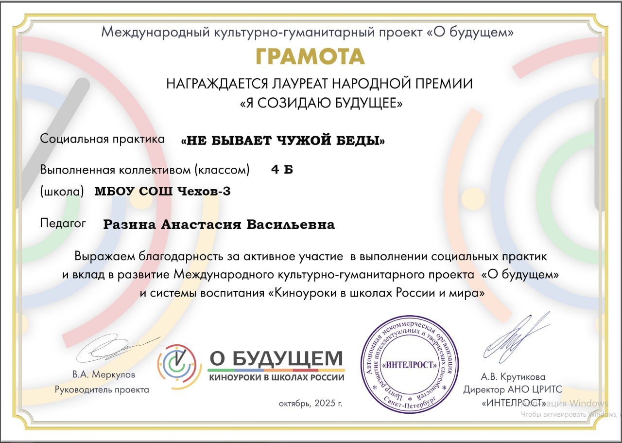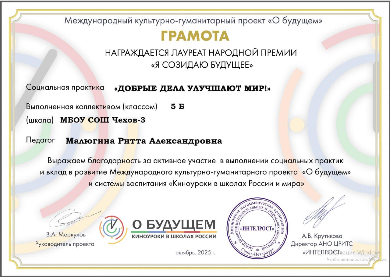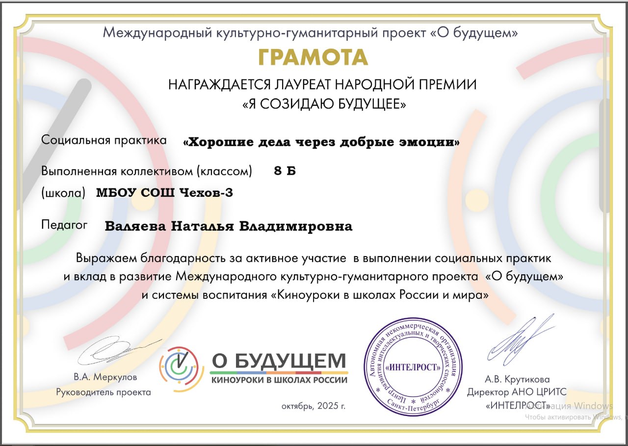 По итогам конкурса социальных практик Международного культурно-гуманитарного проекта «О будущем», реализующего систему воспитания «Киноуроки в школах России и мира» в «Топ-100 лучших социальных практик октября 2025 года» вошли: