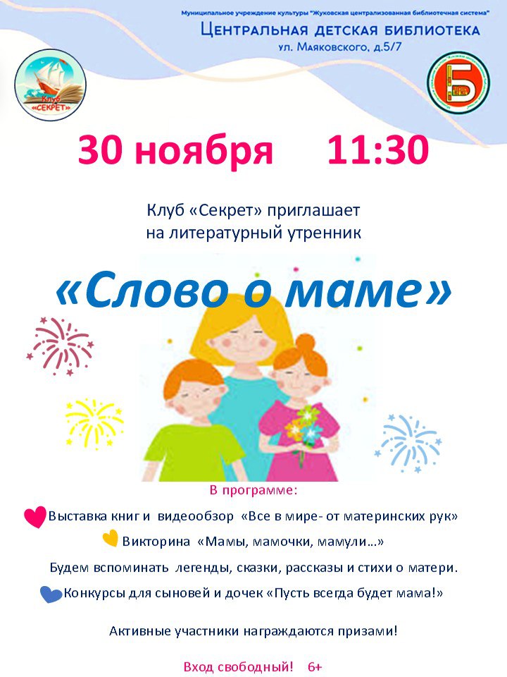 Центральная детская библиотека (ул. Маяковского, д. 5/7) приглашает юных читателей и их родителей 30 ноября в 11:30 на литературный утренник «Слово о маме», который пройдет в рамках работы клуба «Секрет».