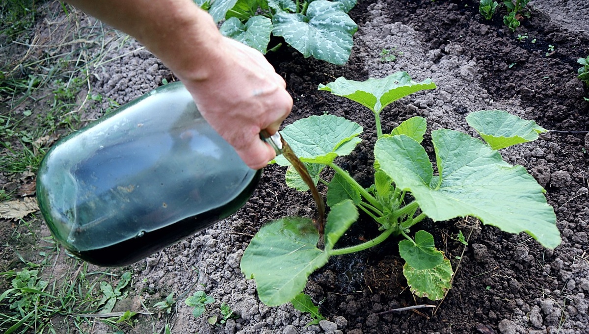 За день до планируемой подкормки стоит подготовить дрожжевой экстракт. Для этого нужно развести одну стандартную пачку сухих дрожжей в трех литрах теплой воды с добавлением двух столовых ложек сахара. Готовый дрожжевой настой следует смешать с предварительно процеженным удобрением из сорняков и банановых кожурок. После этого рекомендуется развести получившуюся смесь с водой в ratio 1:10 и полить кабачки, используя по литру раствора под каждый куст.